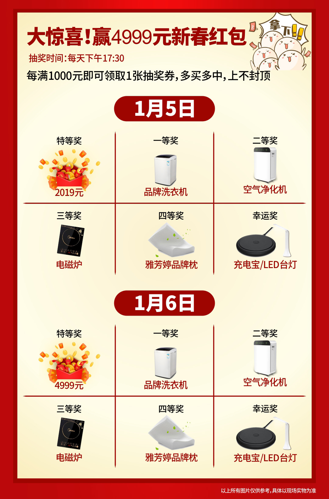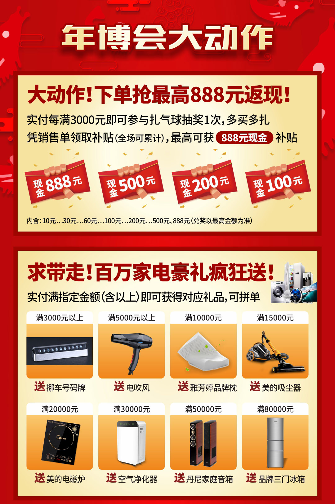 一、百万家电豪礼疯狂送! 二、抢最高888元现金 三、赢4999元新春红包